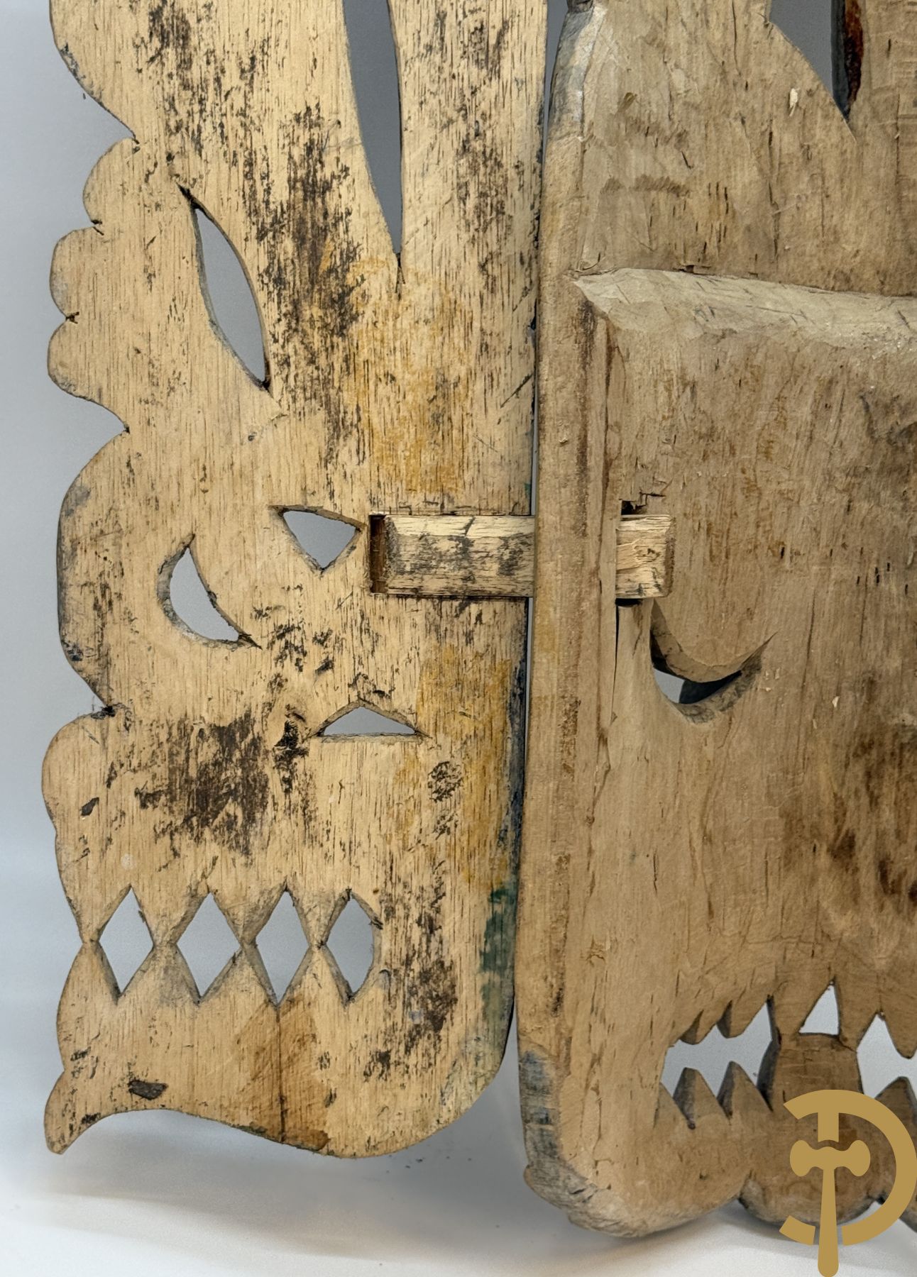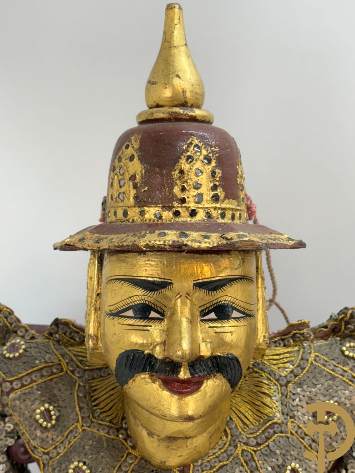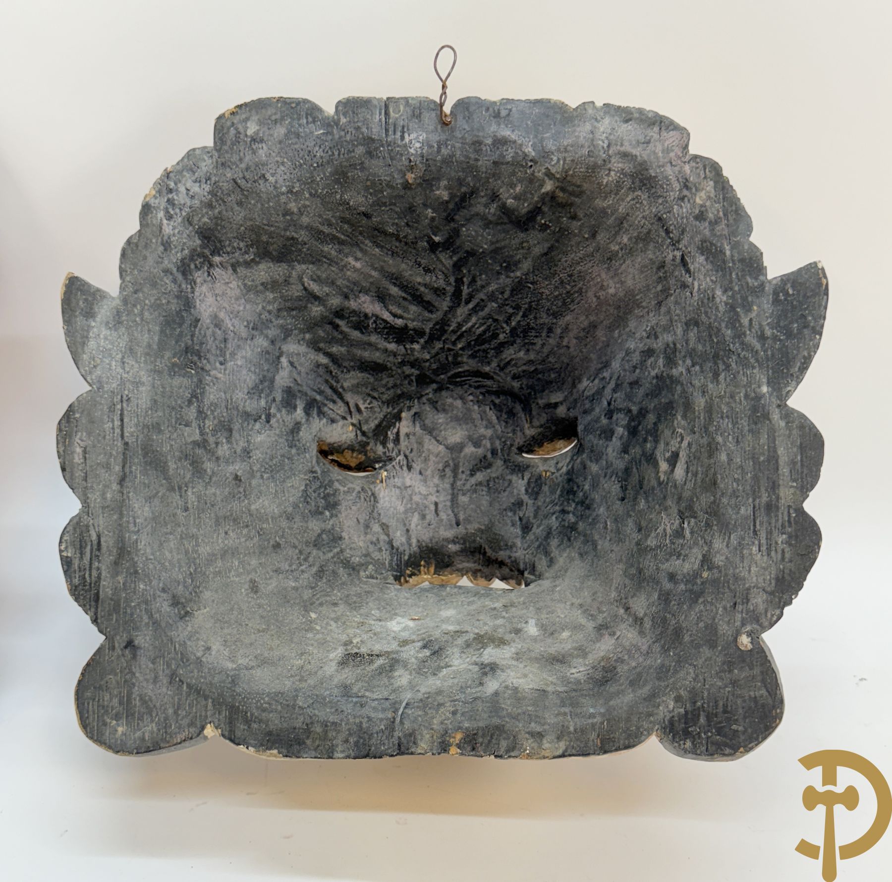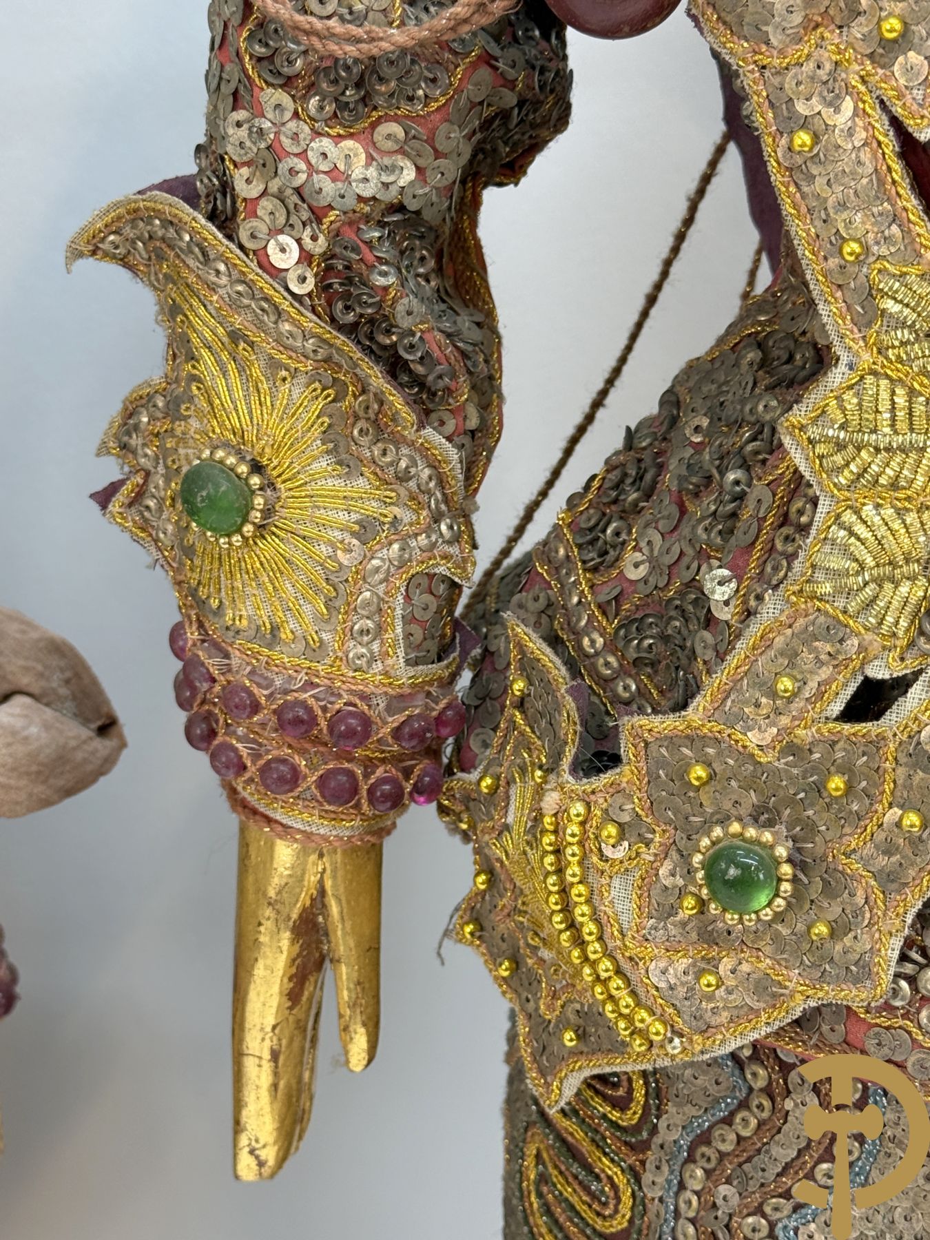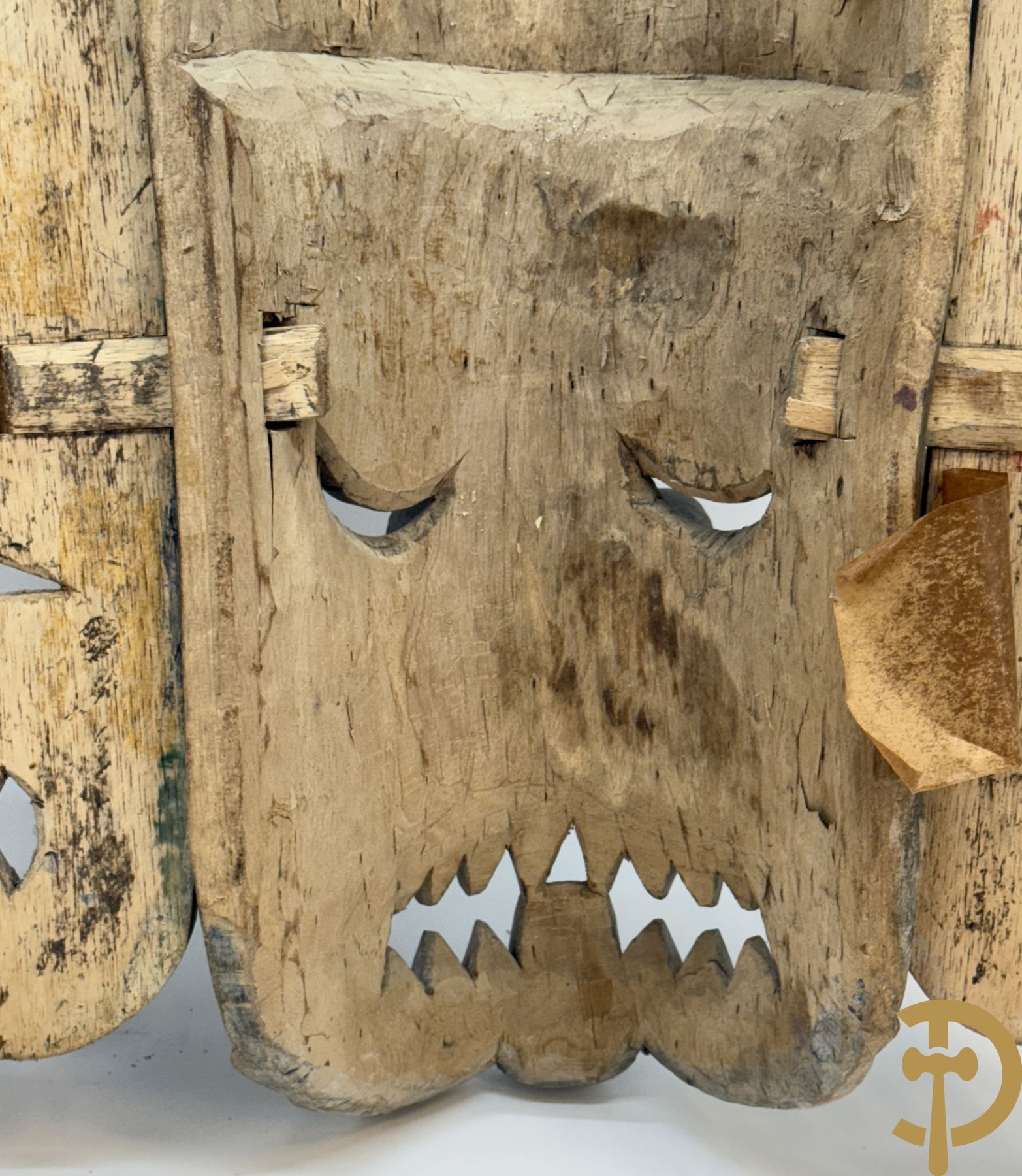 LOT 45 - Balinese kunst : groot gesculpteerd masker + 2 gepolychromeerde maskers + 2 houtgesculpteerde poppen met fijne klederdracht