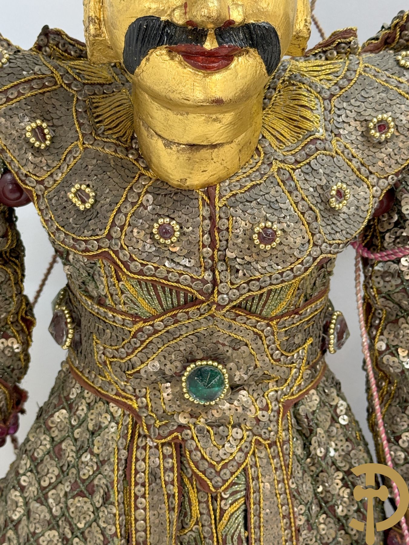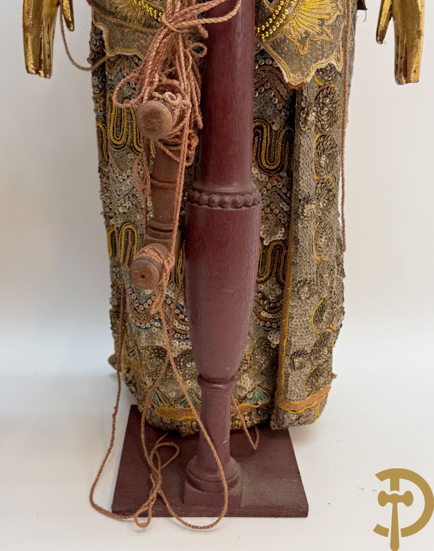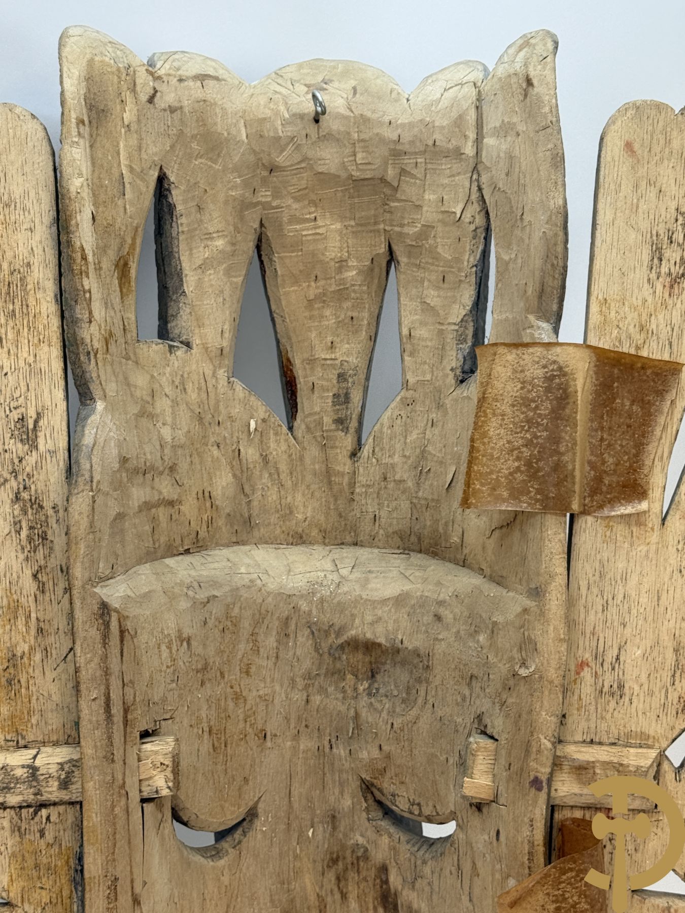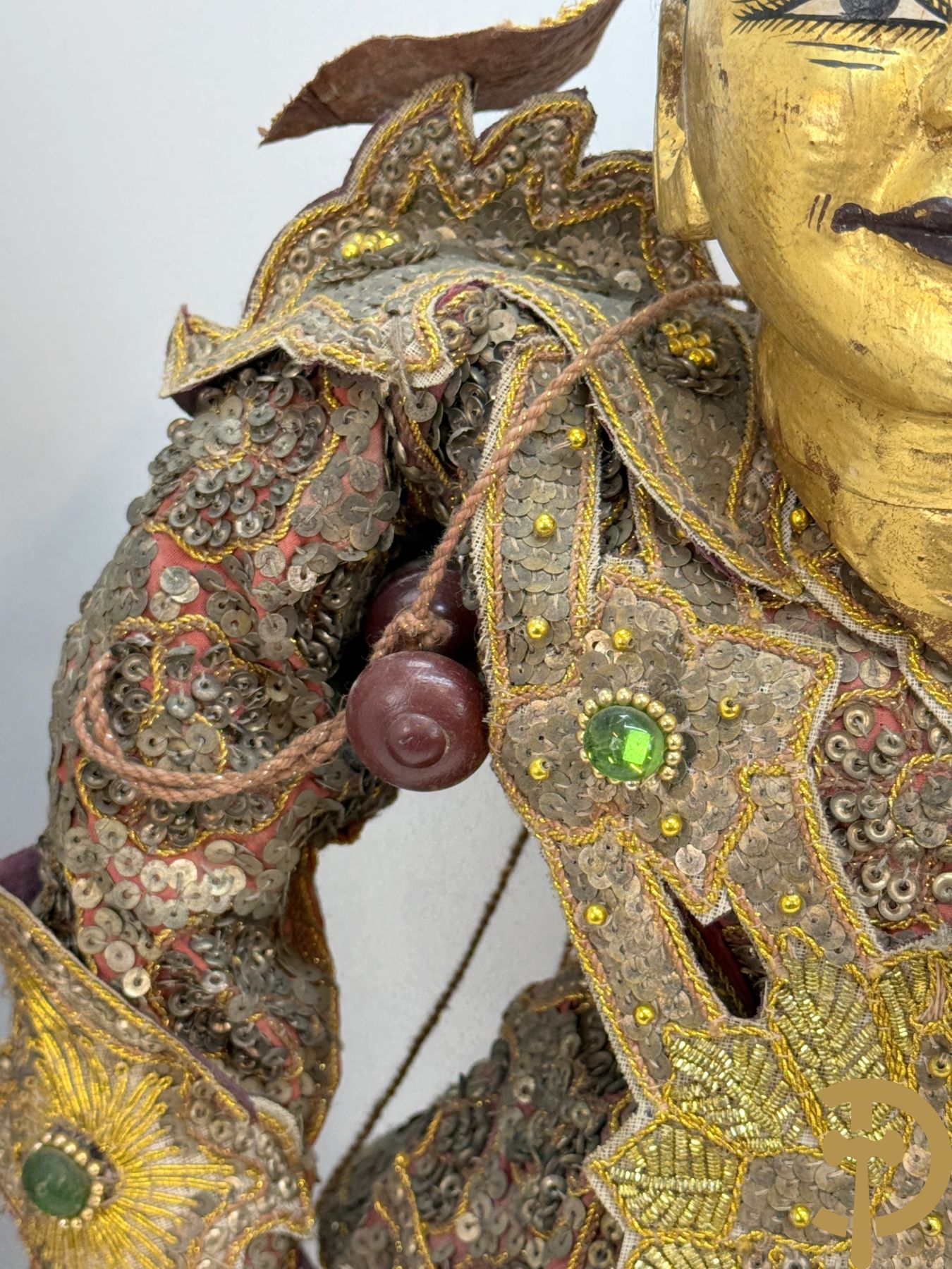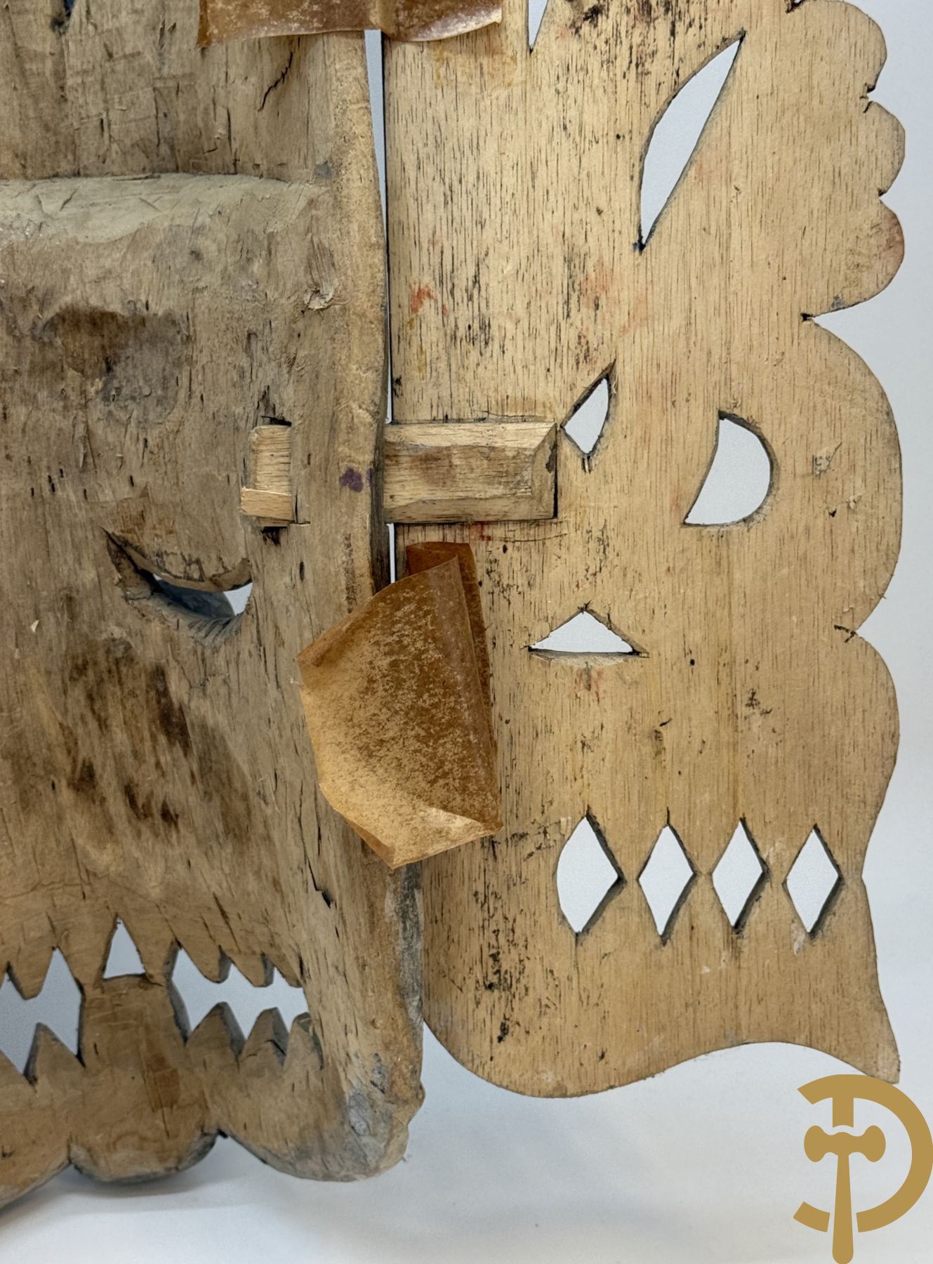 LOT 45 - Balinese kunst : groot gesculpteerd masker + 2 gepolychromeerde maskers + 2 houtgesculpteerde poppen met fijne klederdracht