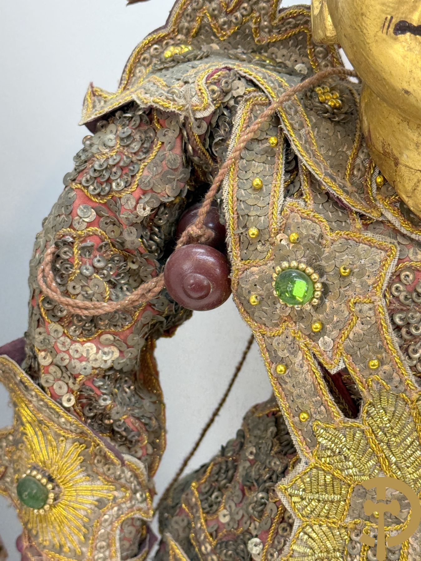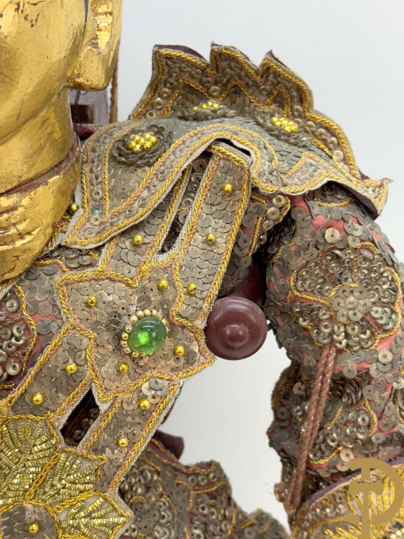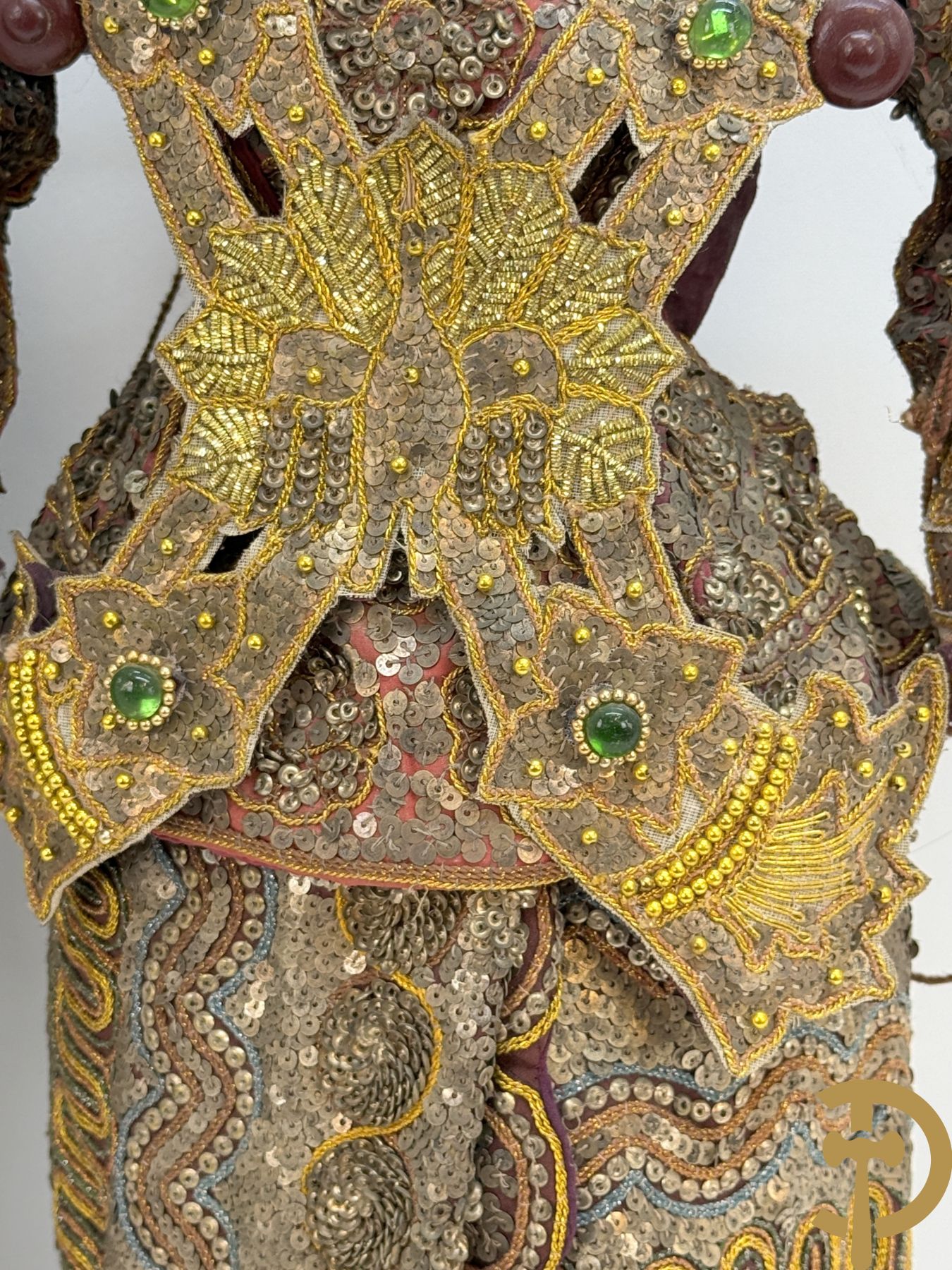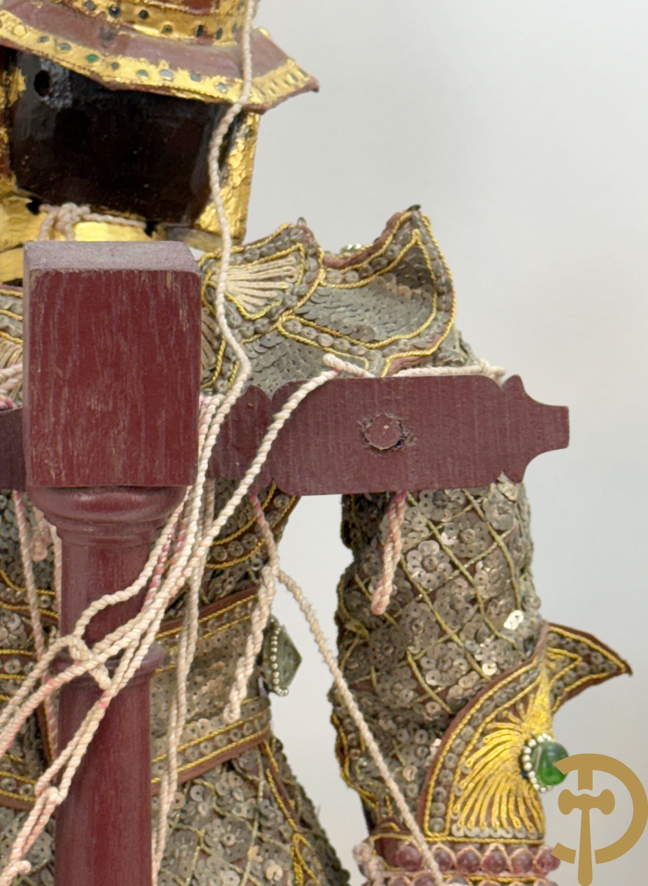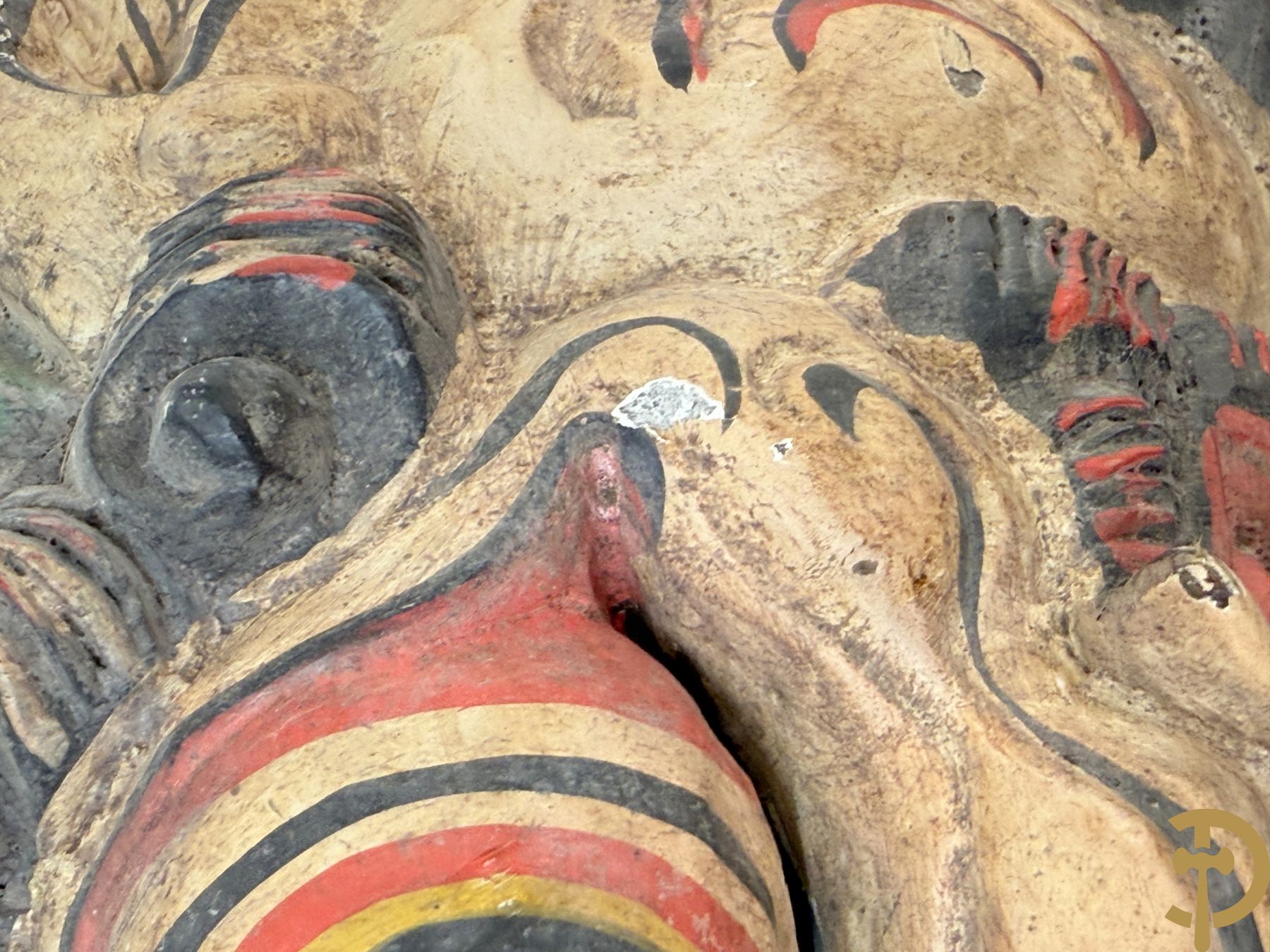 LOT 45 - Balinese kunst : groot gesculpteerd masker + 2 gepolychromeerde maskers + 2 houtgesculpteerde poppen met fijne klederdracht