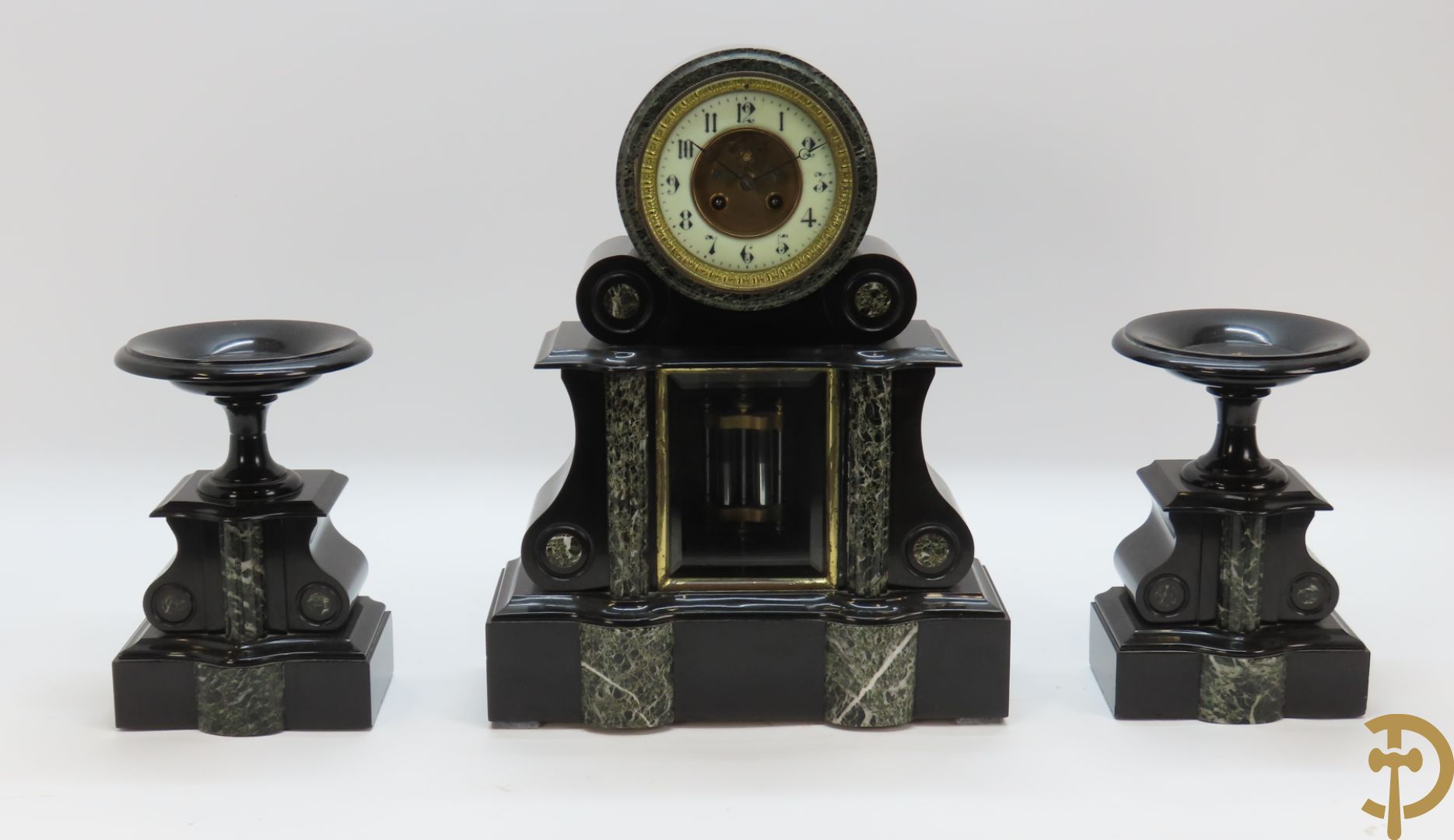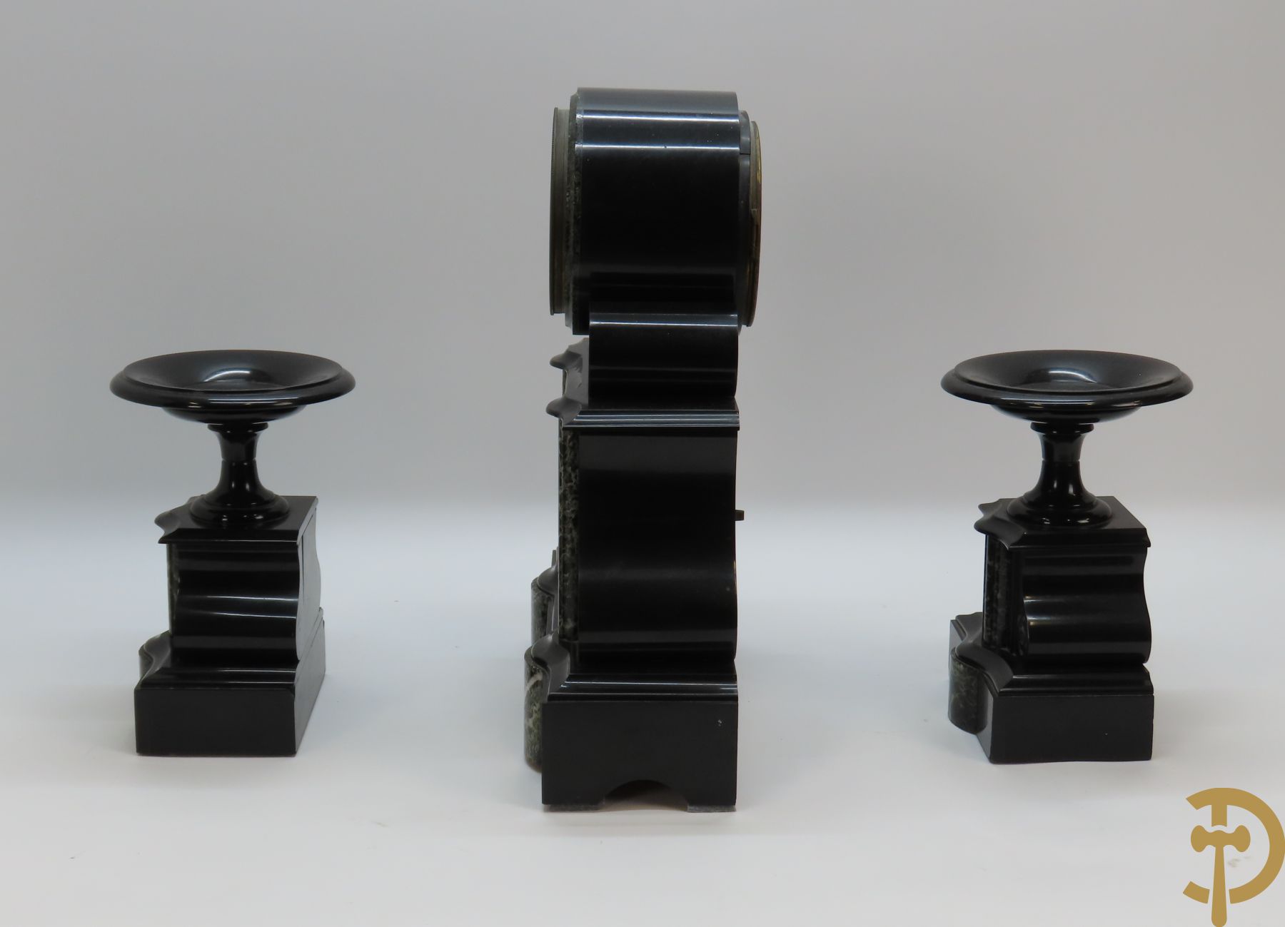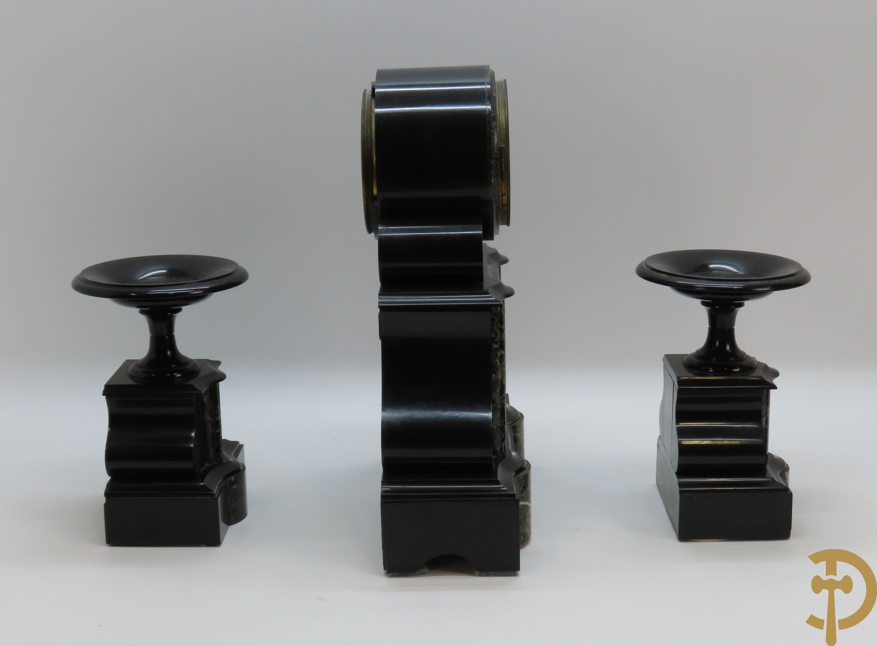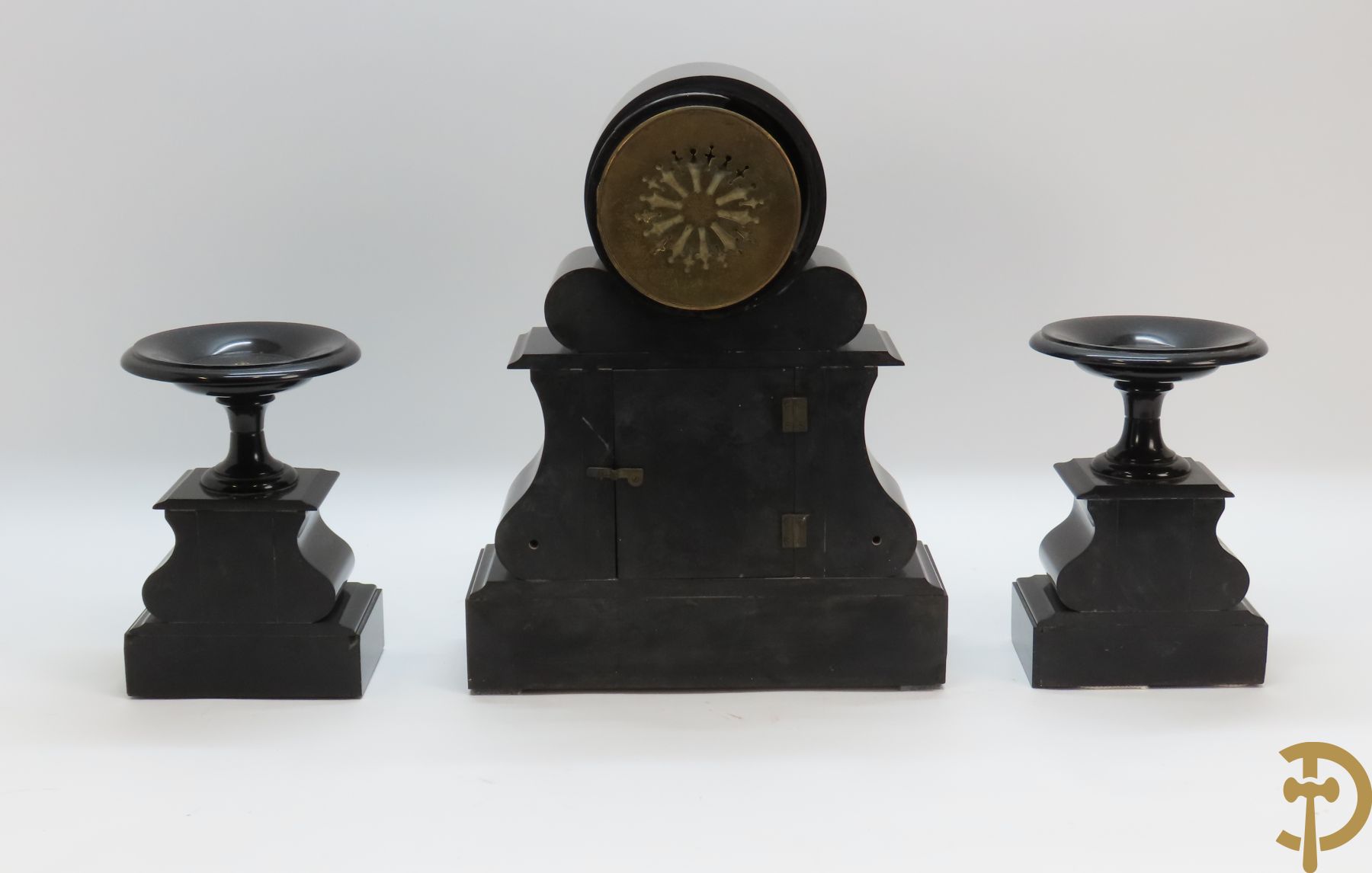LOT 696 - Zwart marmeren garnituur Louis Philippe met kwikslinger, geflankeerd door 2 cassolettes