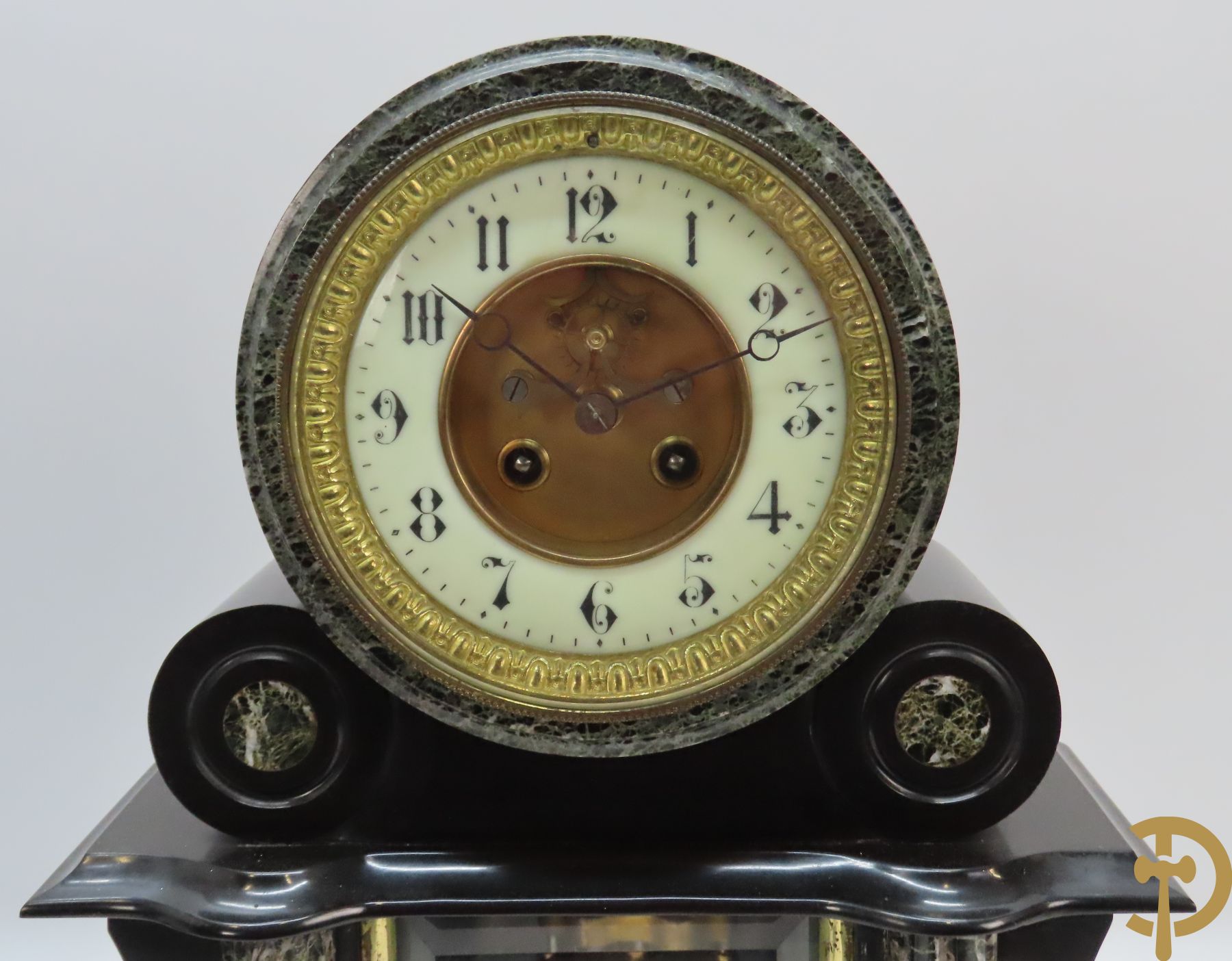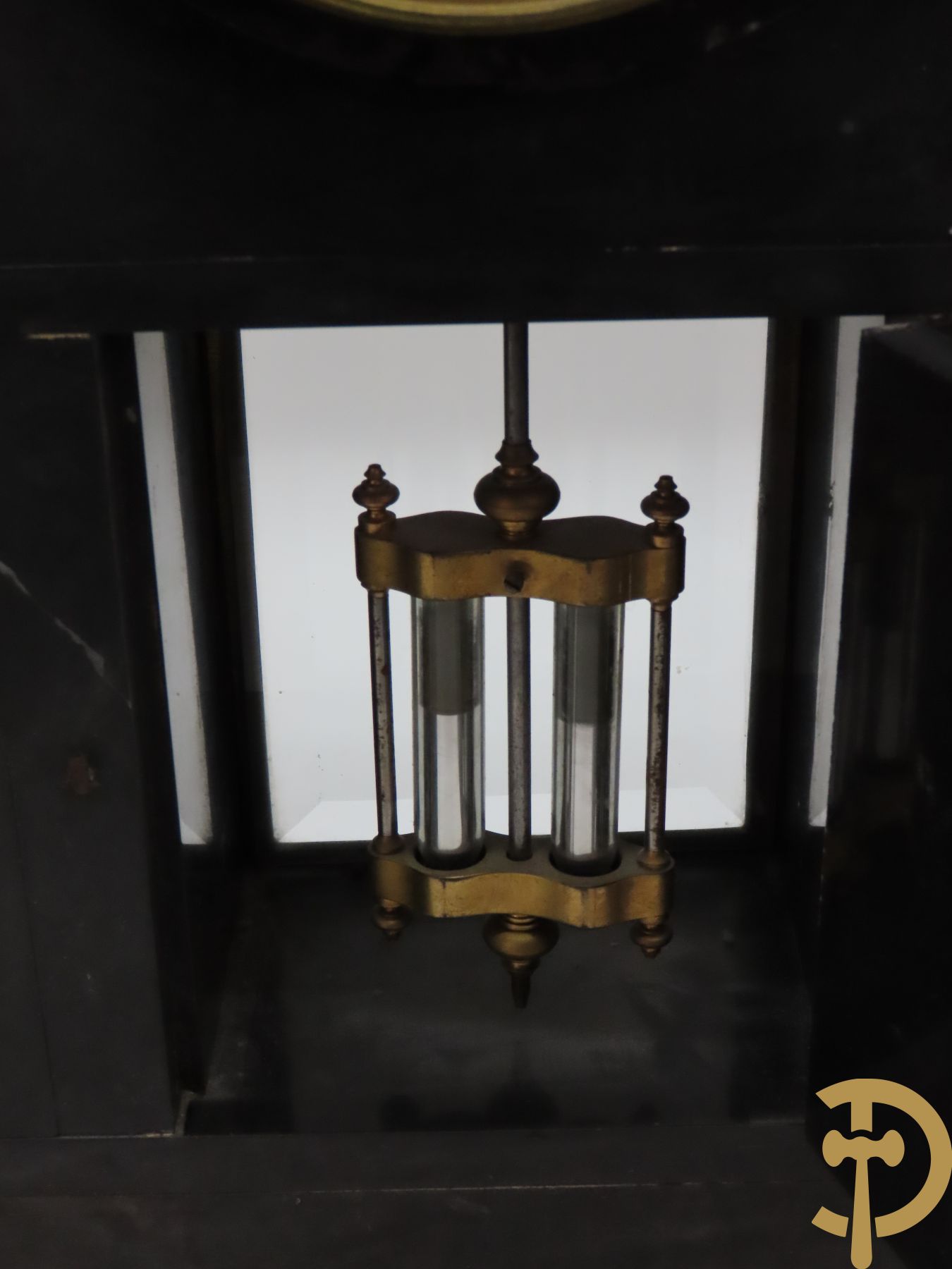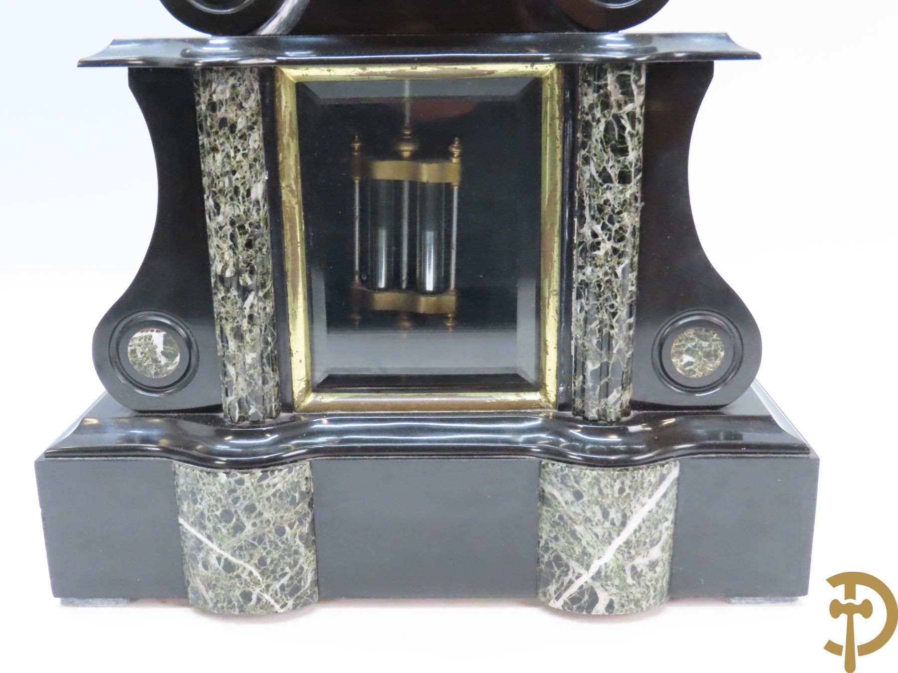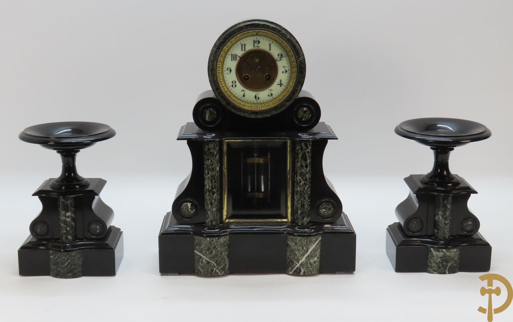 LOT 696 - Zwart marmeren garnituur Louis Philippe met kwikslinger, geflankeerd door 2 cassolettes