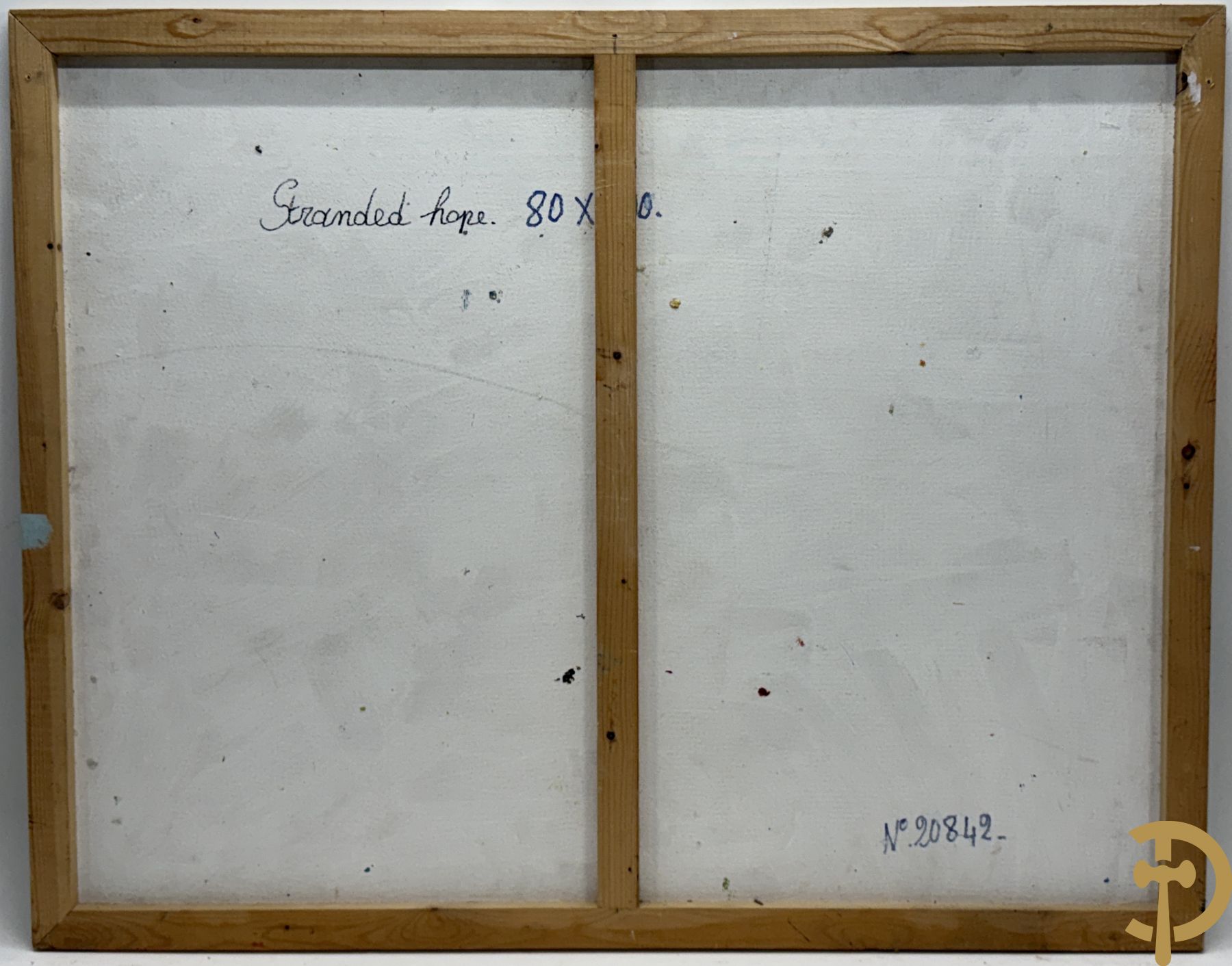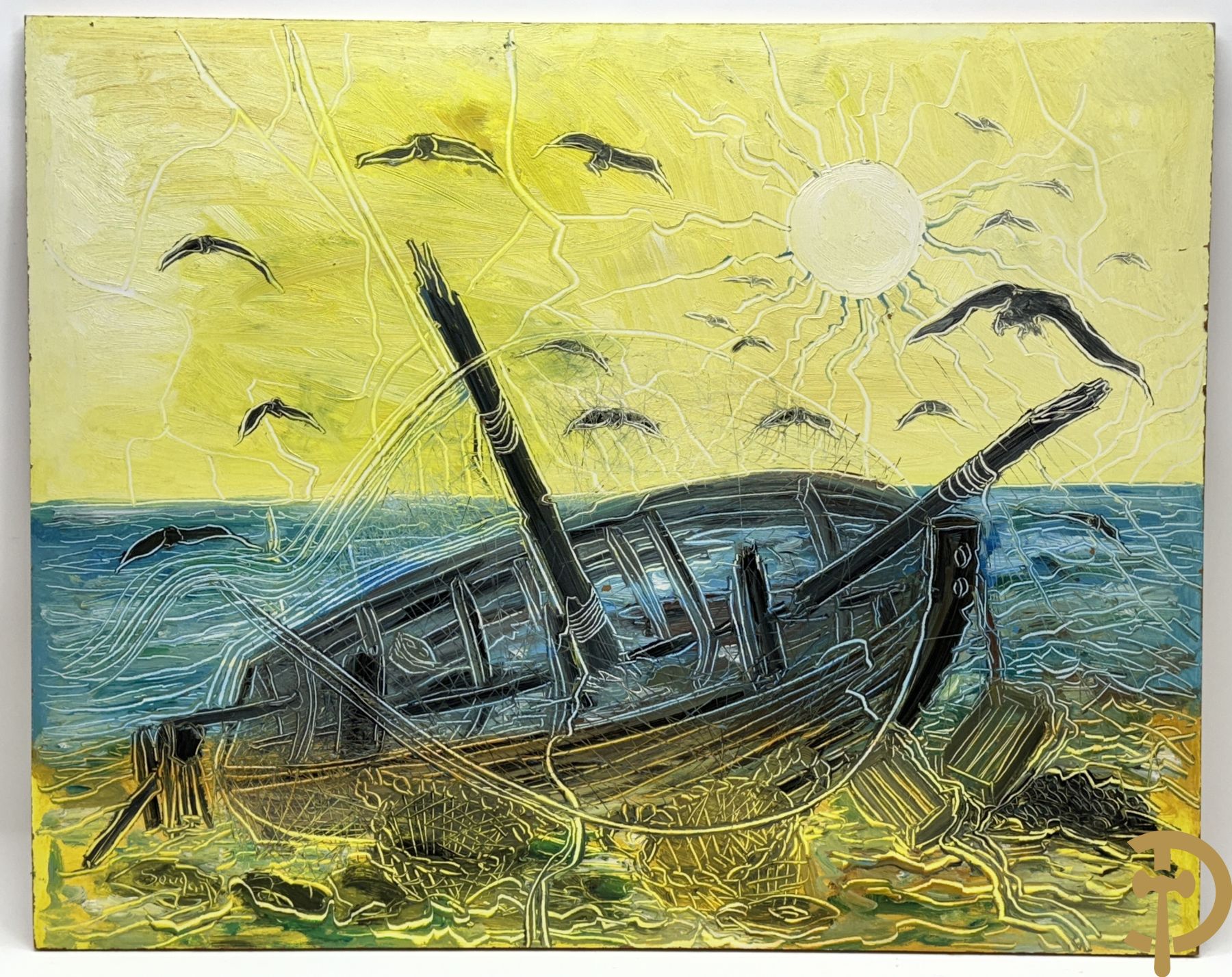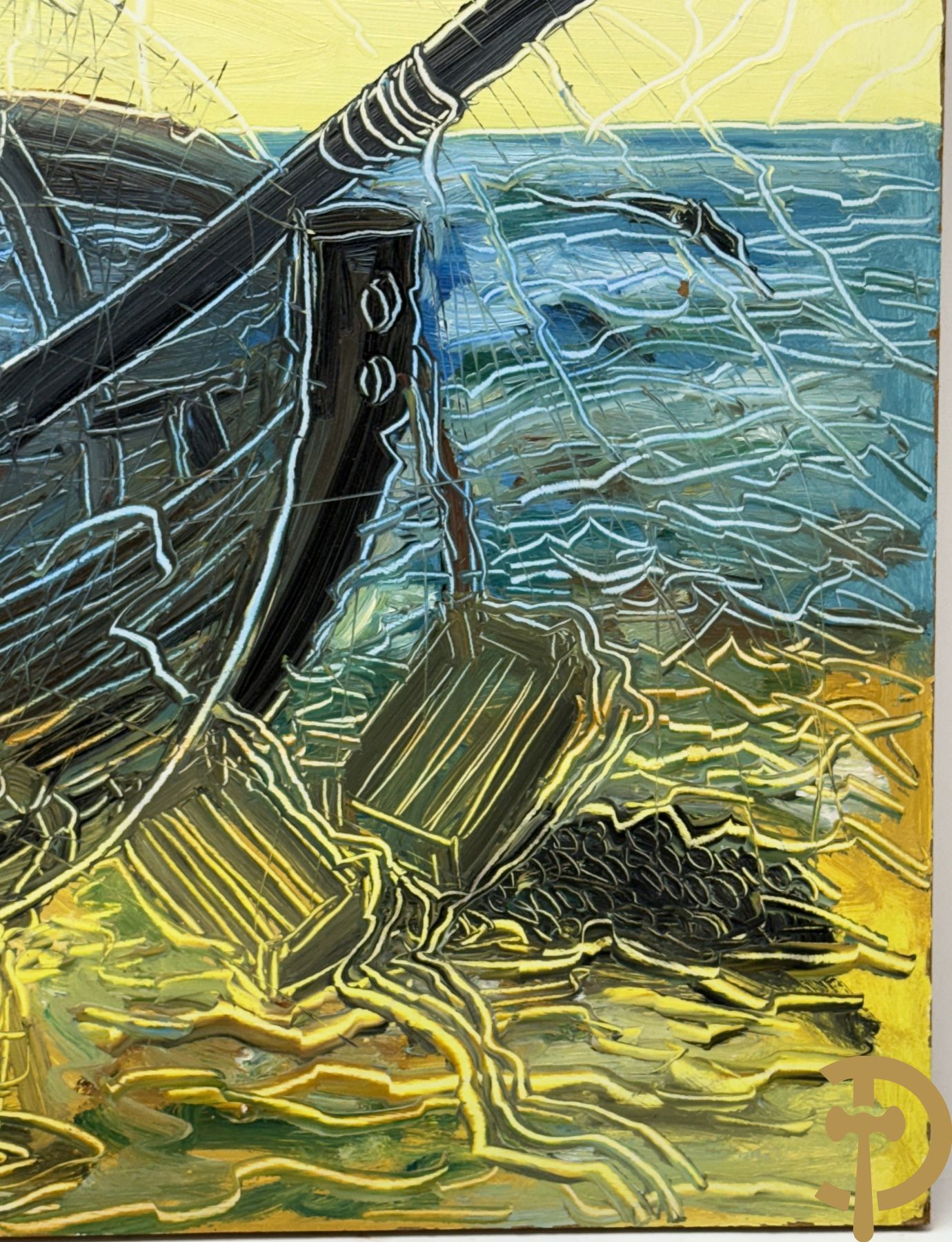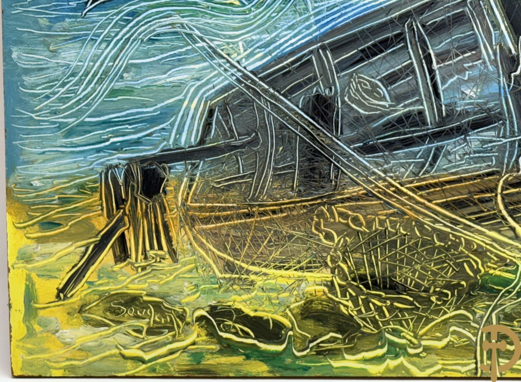 SOUDAN getekend (Lord James) 'Aangemeerde sloep, stranded hope' olie op paneel met krastechniek
