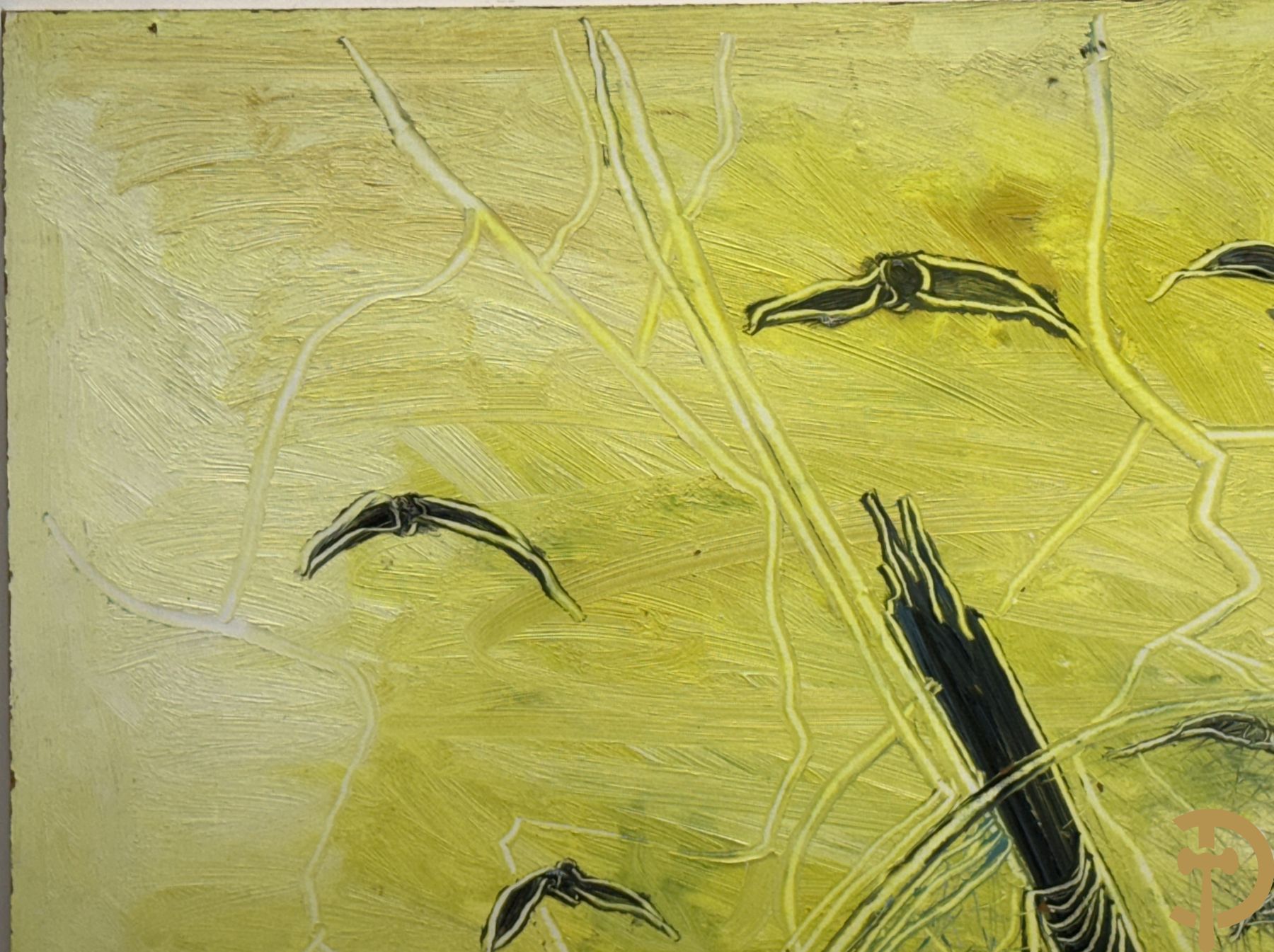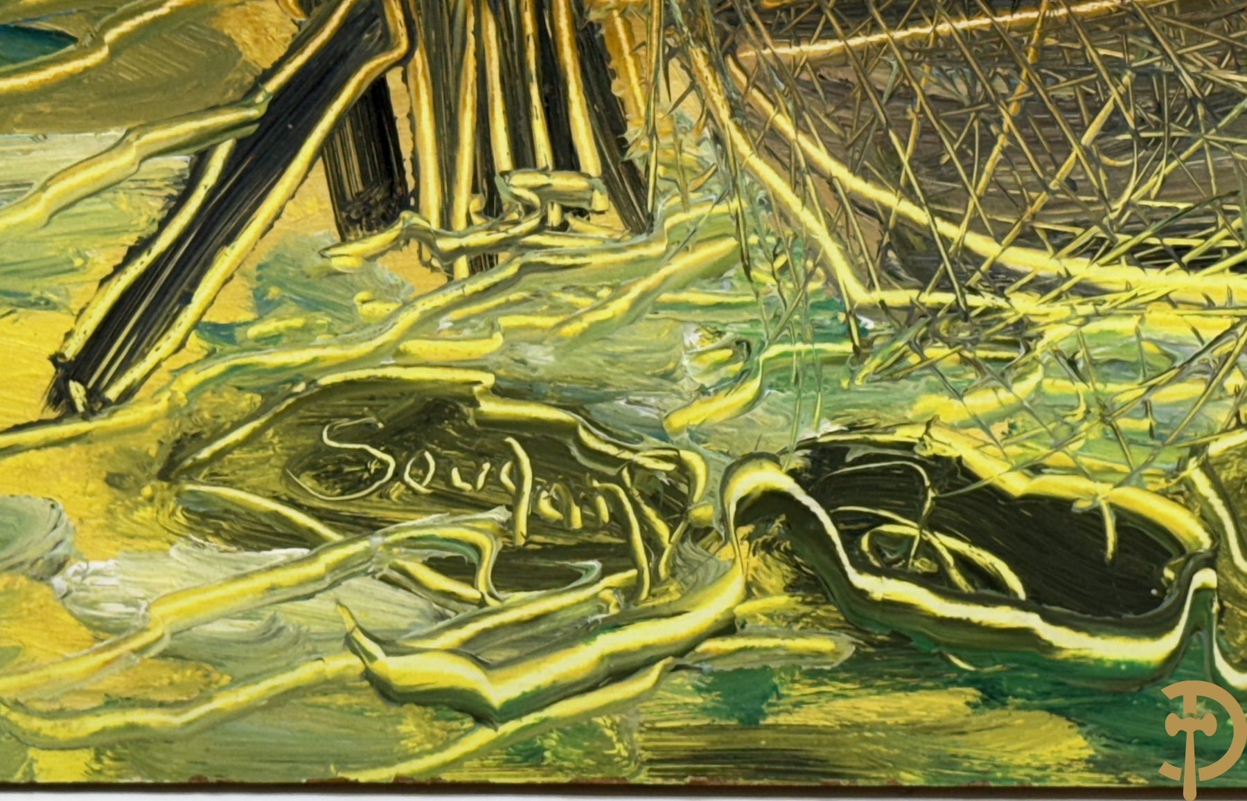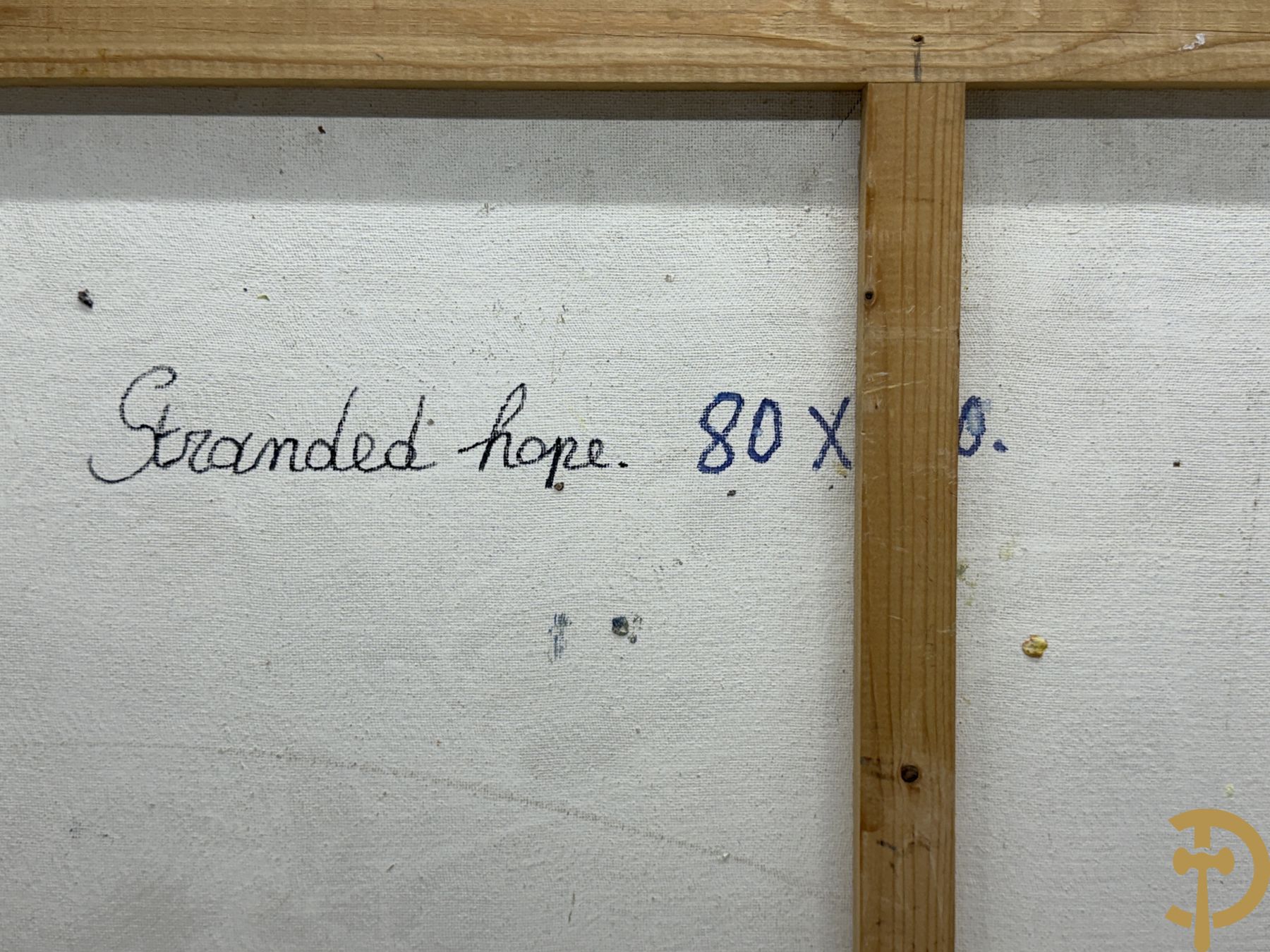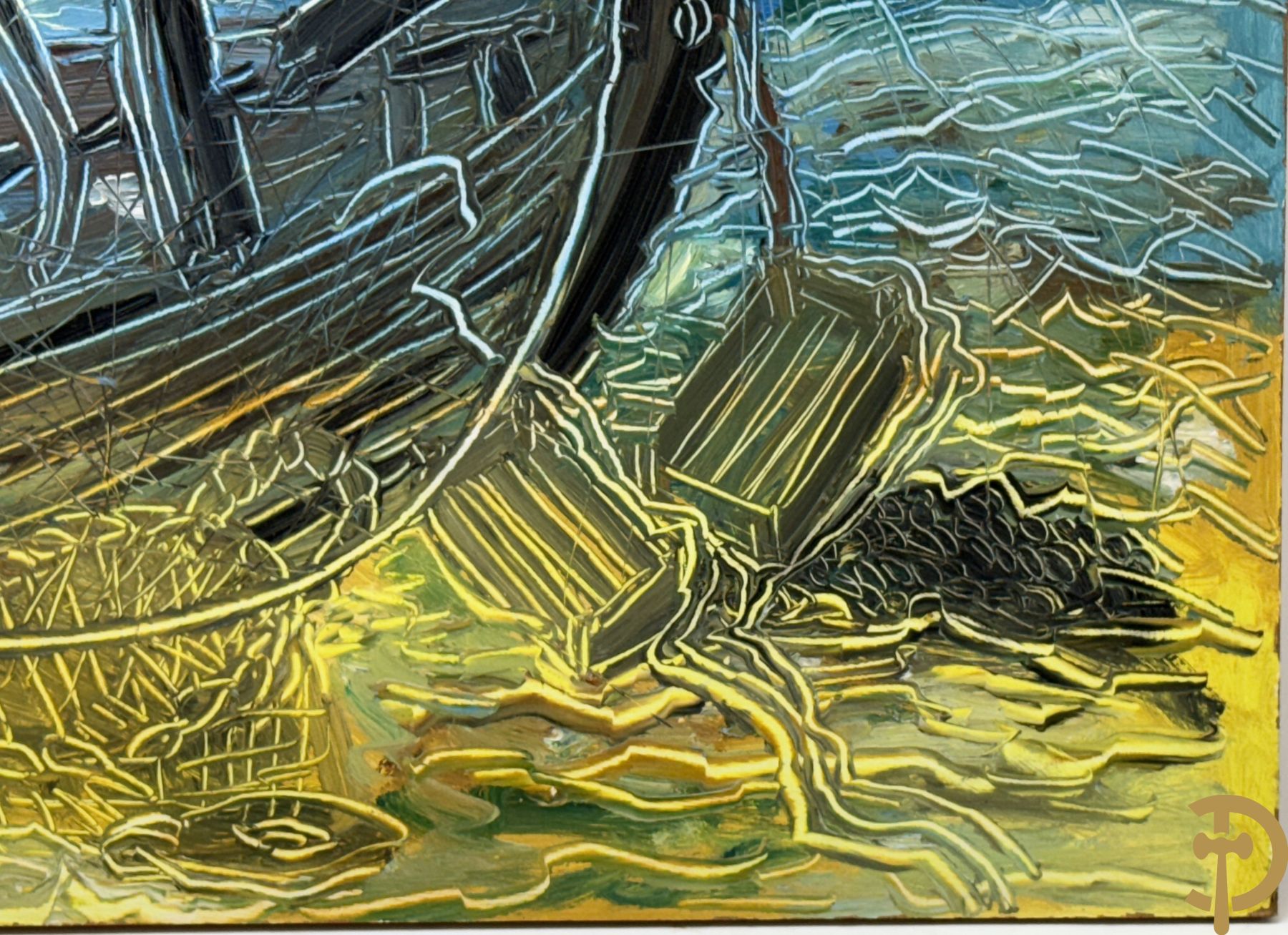 SOUDAN getekend (Lord James) 'Aangemeerde sloep, stranded hope' olie op paneel met krastechniek