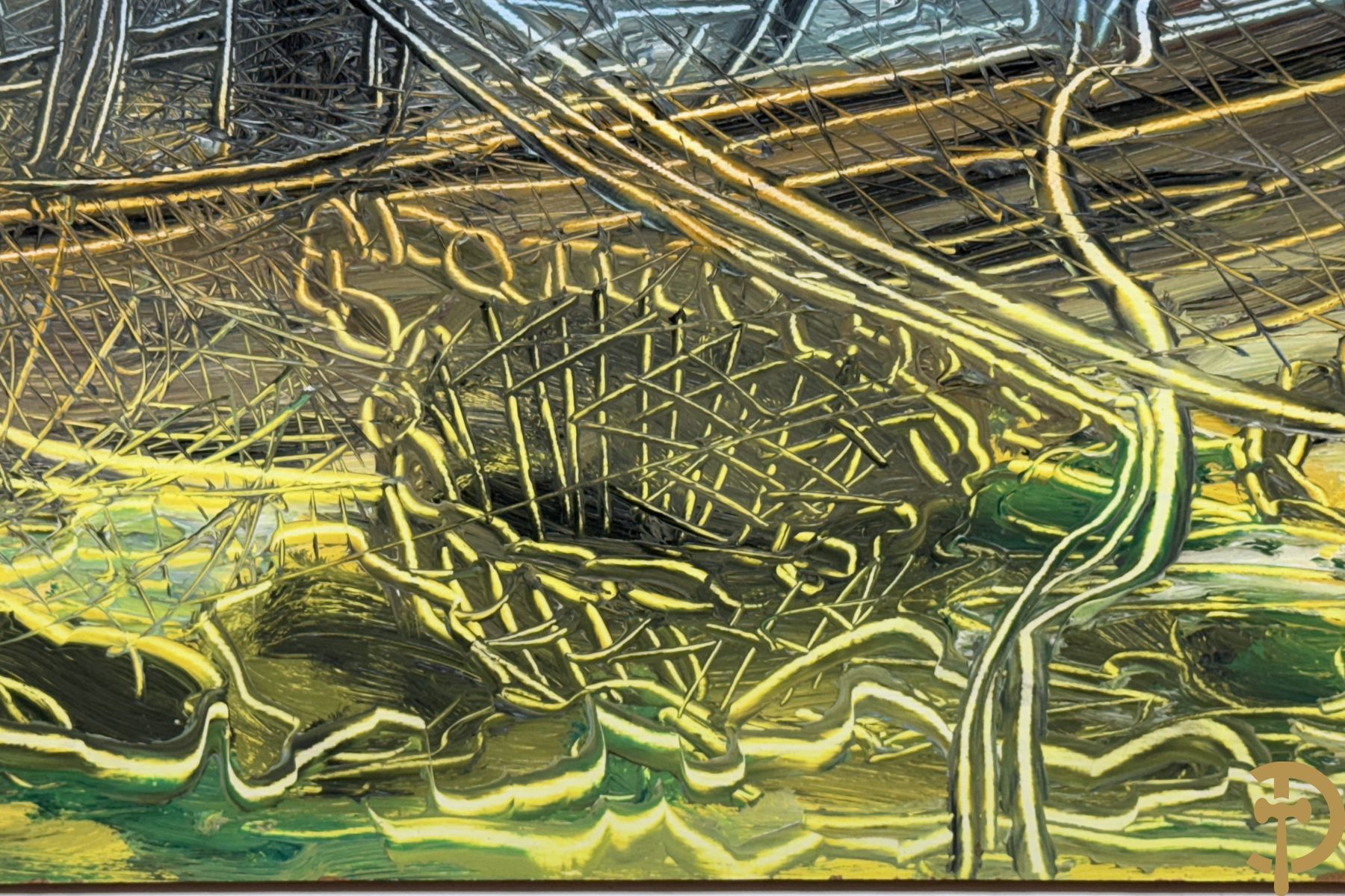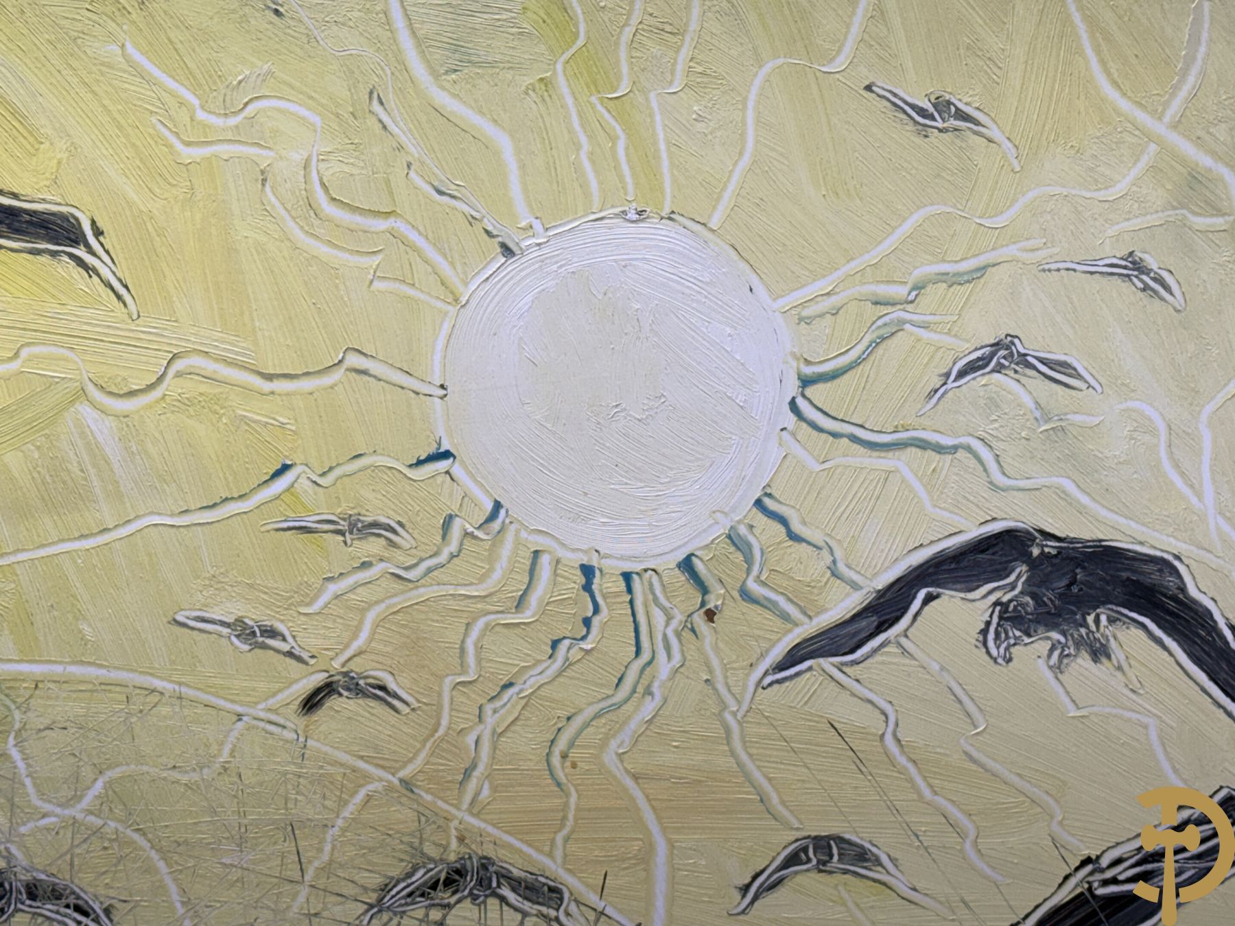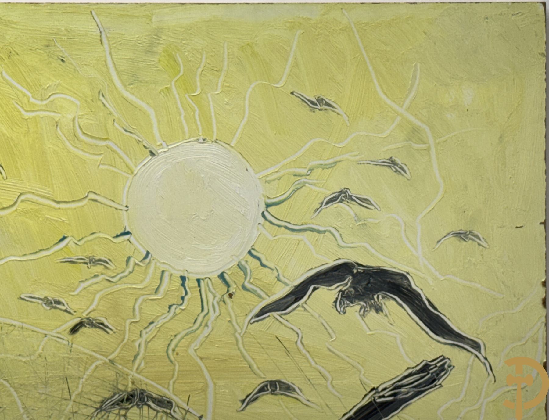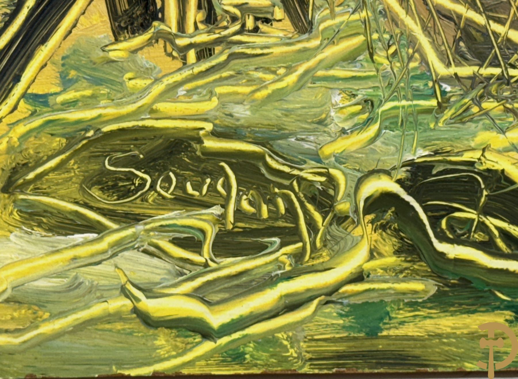 SOUDAN getekend (Lord James) 'Aangemeerde sloep, stranded hope' olie op paneel met krastechniek